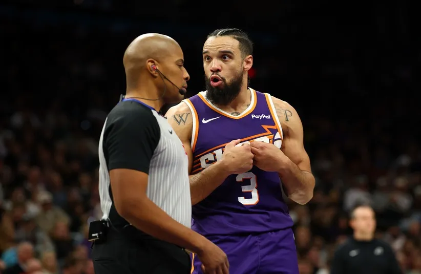 Phoenix Suns forward Dillon Brooks (3) talks to a referee against the Brooklyn Nets in the second half at Mortgage Matchup Center