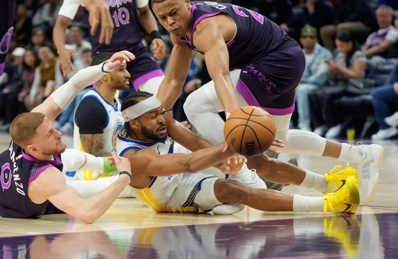 Golden State Warriors guard Moses Moody (4) tussles with Minnesota Timberwolves guard Donte DiVincenzo (0) and guard Jaylen Clark (22) in the second quarter at Target Center