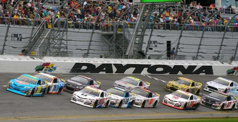 Racers run through the trioval, Saturday February 15, 2025 during the Ride the Dente 200 at Daytona International Speedway.