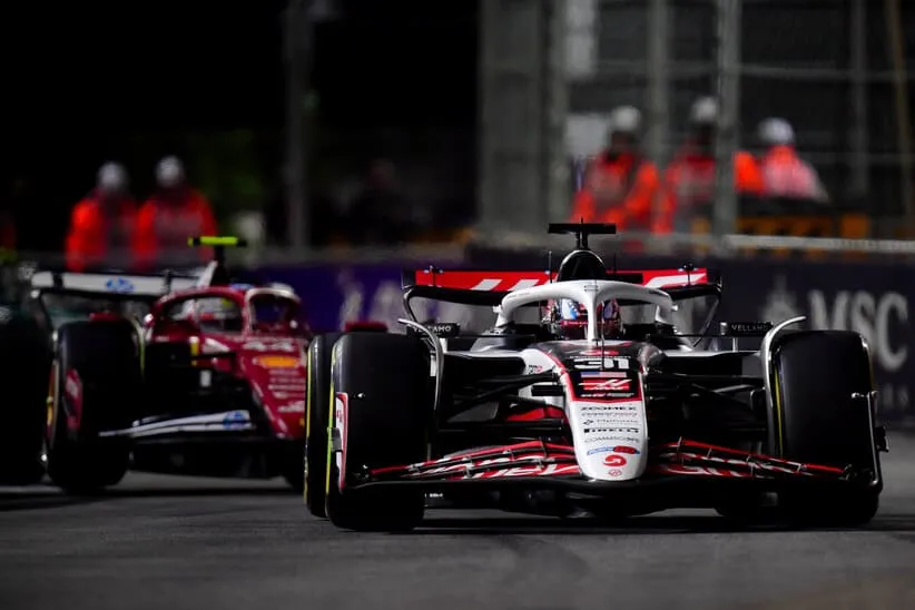 Nov 21, 2025; Las Vegas, NV, USA; Haas F1 Team driver Esteban Ocon (31) leads Ferrari driver Lewis Hamilton (44) during the Las Vegas Grand Prix at Las Vegas Strip Circuit.