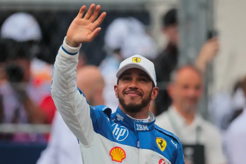 May 3, 2025; Miami Gardens, FL, USA; Ferrari driver Lewis Hamilton (44) reacts after finishing third during the F1 Miami Grand Prix Sprint Race at Miami International Autodrome. Mandatory Credit: Sam Navarro-Imagn Images