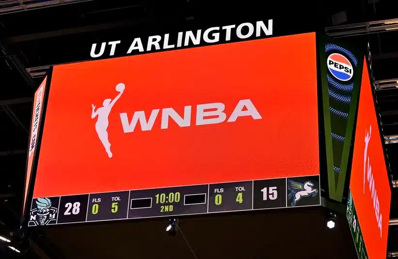 A view of the scoreboard and the WNBA logo as an announcement is made about throwing any toys or objects on to the court during the first half of the game etween the Dallas Wings and the New York Liberty at College Park Center.
